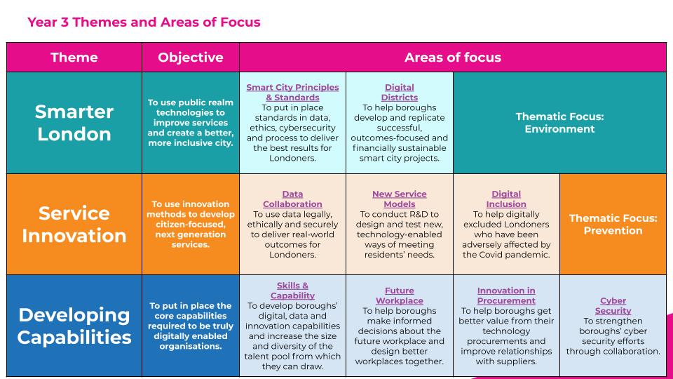 Over the past few months we have consulted widely with our membership on where we should head in Year 3. Based on their feedback, we’ve decided to focus our efforts across three themes. The first is on Developing Capabilities. We’ll be exploring how we can boost boroughs’ access to data talent, navigate decisions about the post-Covid workplace, procure better and boost their cyber security.