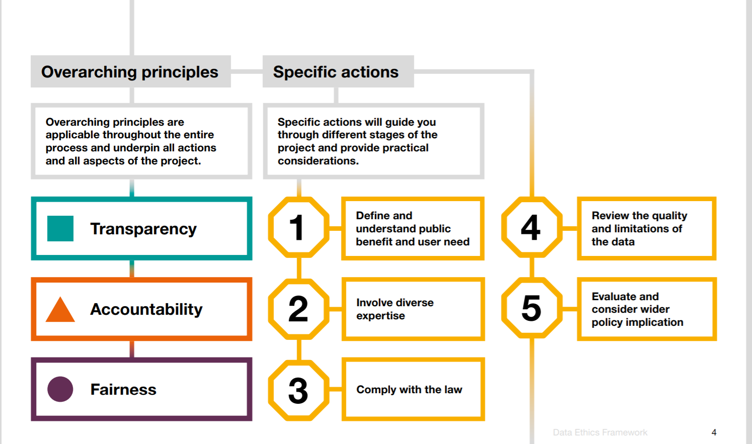 - Fairness: How do we mitigate biases which may influence our data modelling? How do we ensure that the project and its outcomes respect the dignity of individuals, are just, non-discriminatory, and consistent with the public interest, including human rights and democratic values?